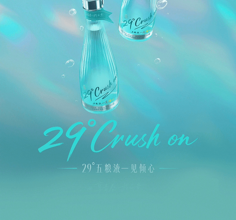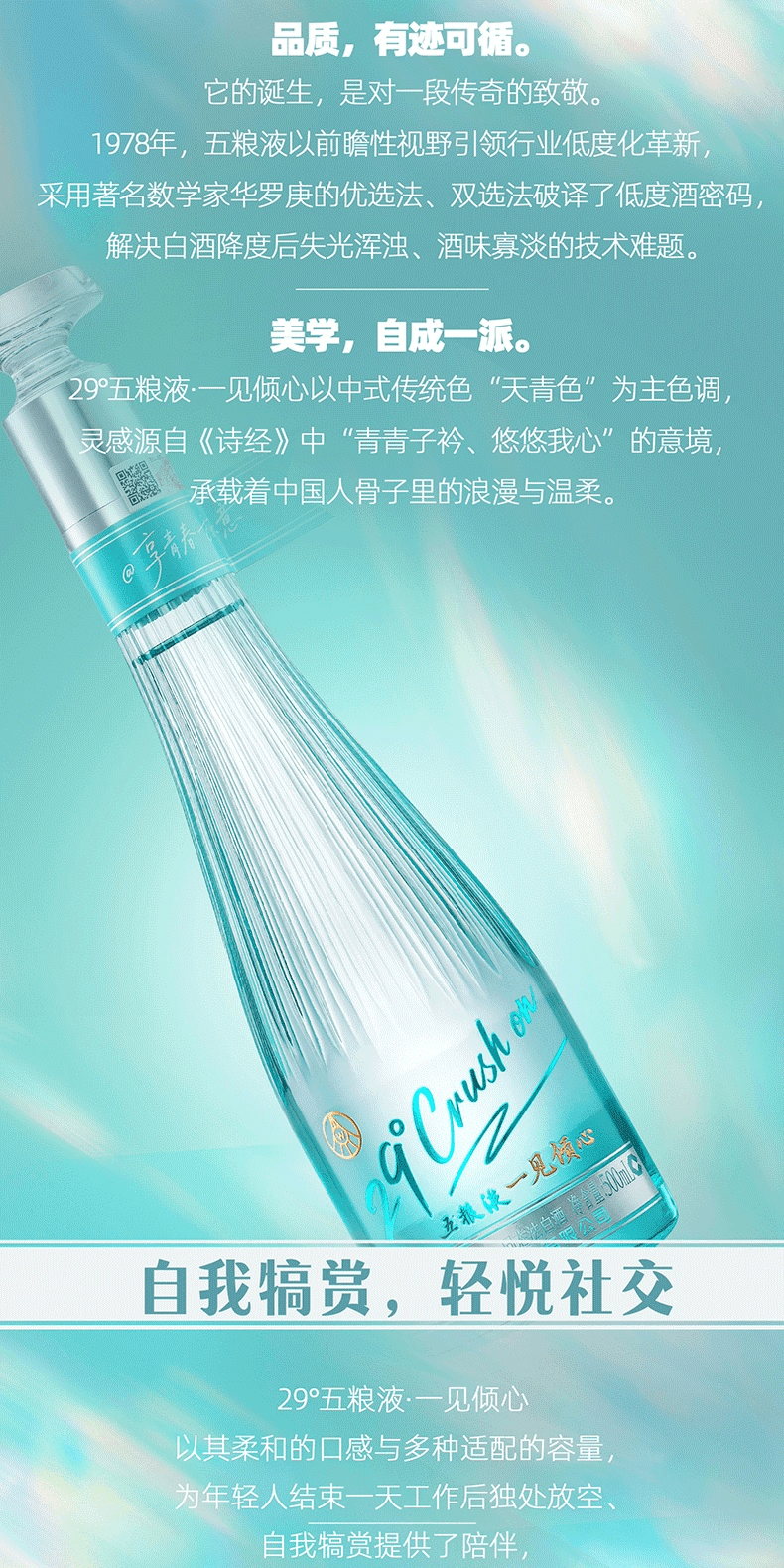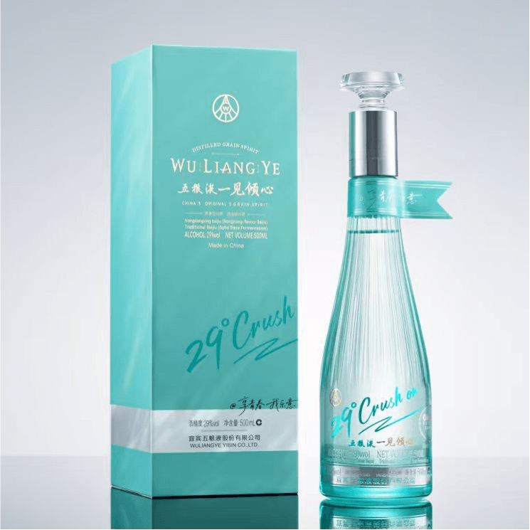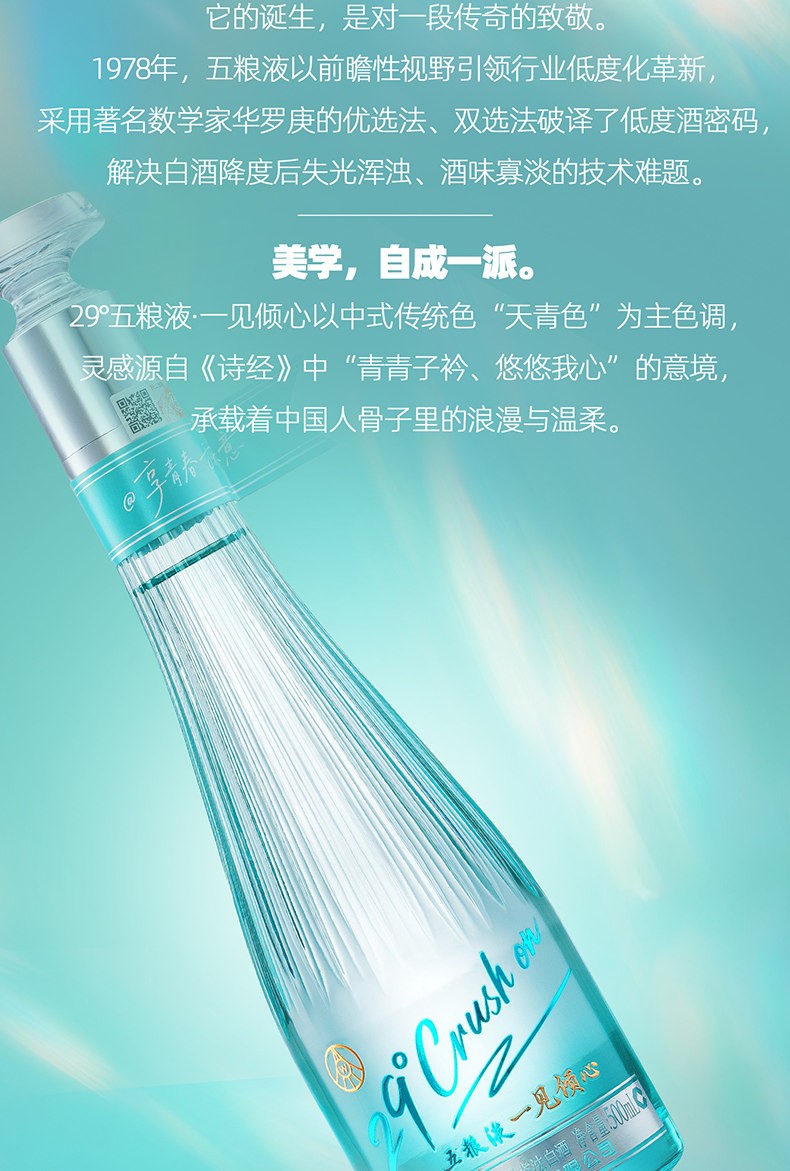 29°五糧液一見傾心以中式傳統色“天青色”為主色調靈感源自《詩經》中“青青子衿、悠悠我心”的意境,承載著中國人骨子裏的浪漫與溫柔。同时,29°五糧液 · 一見傾心是五糧液打造的創新低度白酒,融合傳統工藝與現代口感,以"微醺不醉"的獨特體驗,開啟白酒的輕社交新時代。