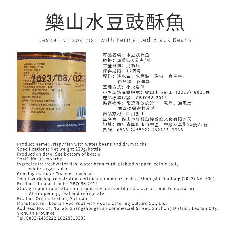 天府街市,香港的四川味道! 正宗川貨,一口四川,滿滿家鄉風味,只在天府街市等你品嚐! 產品名稱:水豆豉酥魚 主要配料:淡水魚、水豆豉、泡椒 規格:230g/罐 水豆鼓又稱「納豆」, 富含多種對人體有益的氨基酸、多腦等, 是優質大豆經發酵後, 加入生姜、泡椒、鹽形成水豆鼓。 口感特點: 魚肉酥脆,鼓汁泡椒味突出,是佐酒拌菜的佳品。